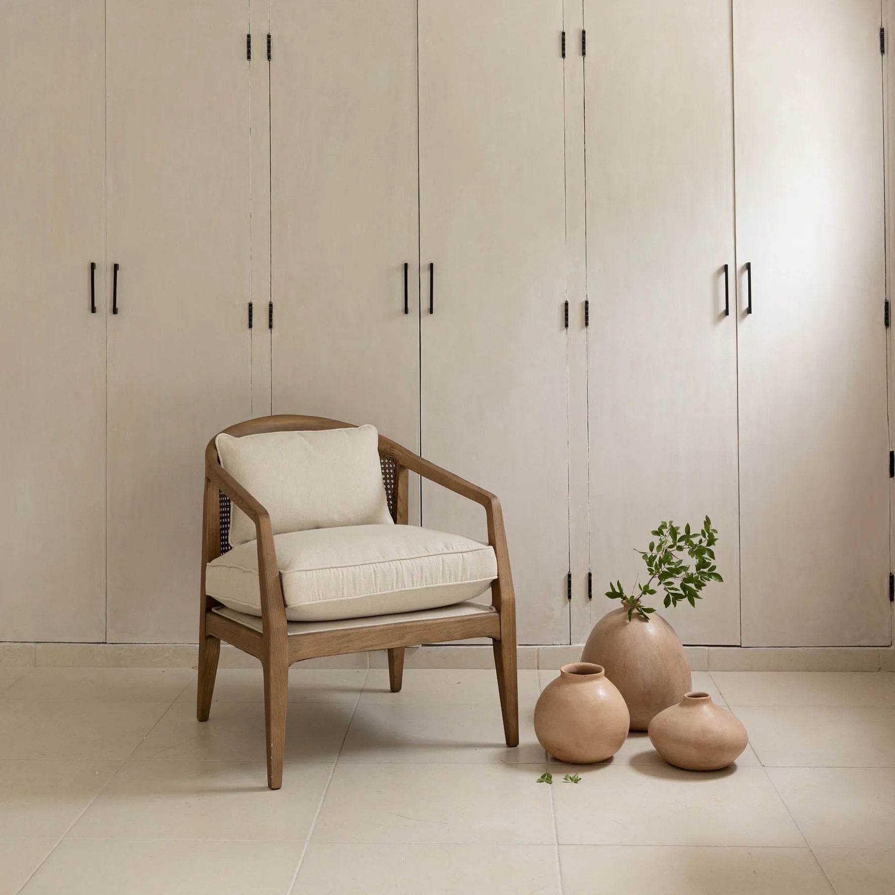 Boucle fabric and ash wood make up this timeless piece. Immerse yourself in the clean silhouette with subtle curves. With a beautiful rattan back and removable cushions on the seat and back, this armchair is a design that will accentuate the coastal retreat feeling, creating the perfect balance for your dream living space.
