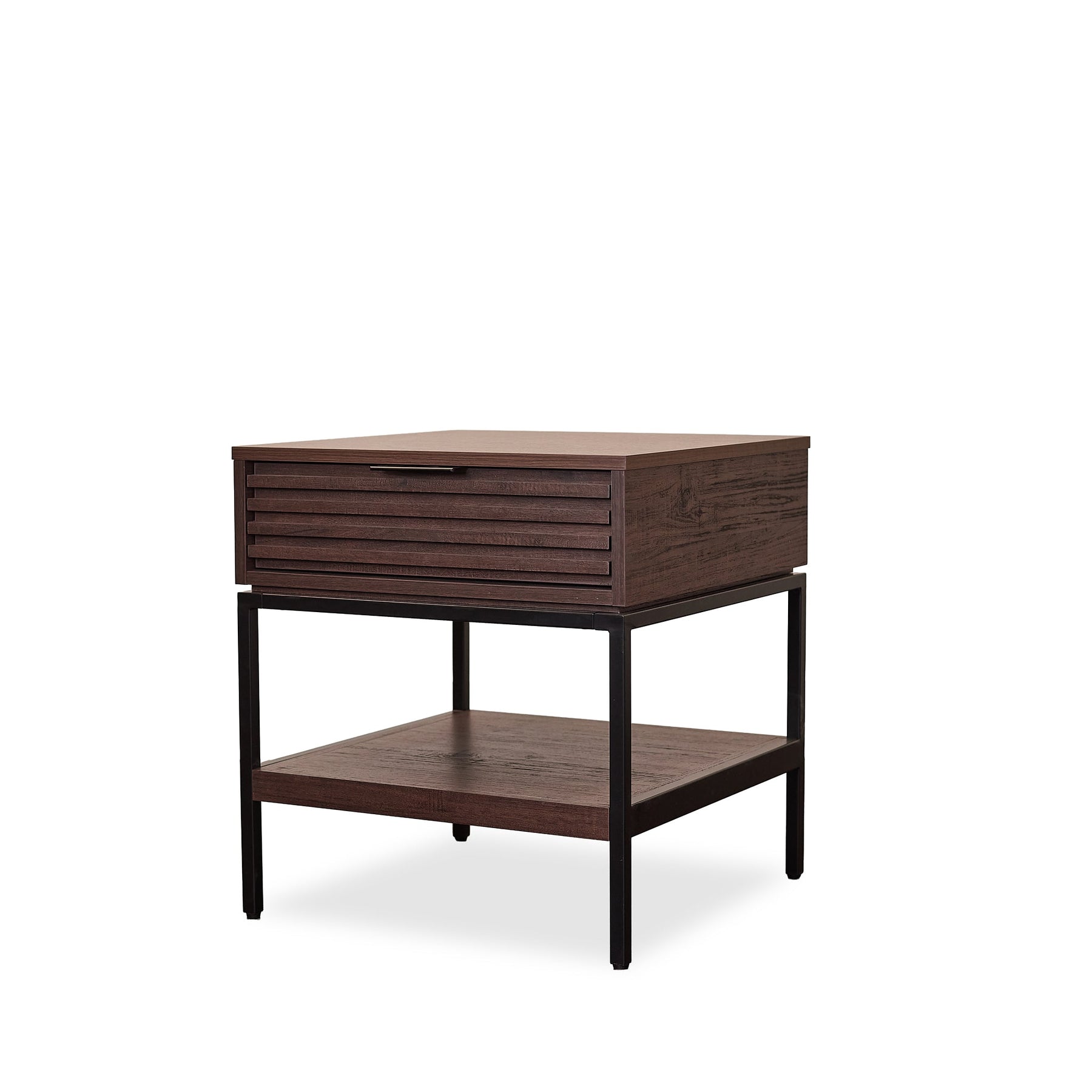 Astor Walnut End Table blends mid-century modern style with a rich walnut veneer, offering a bold balance of warmth and structure. Featuring a fluted drawer front, open lower shelf, and slim black metal legs, this piece is perfect for living rooms, bedrooms, or reading nooks. Whether you’re looking for functional storage or a refined statement piece, this end table is a timeless and versatile choice. Lifestyle images may be AI-generated. Please refer to the standalone images or request additional angles for accuracy.