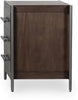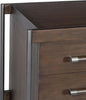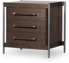 A float-like design lends a light look to bedside storage. Slim metal sides secure three drawers of brown-finished mahogany, for a modern look with organic presence.