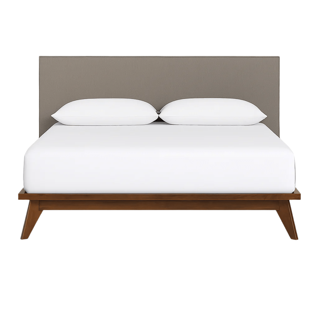 The Denali Bed combines a natural wood platform with a sage green upholstered headboard, offering a serene and modern look. Available now at What's New Furniture in Portland.