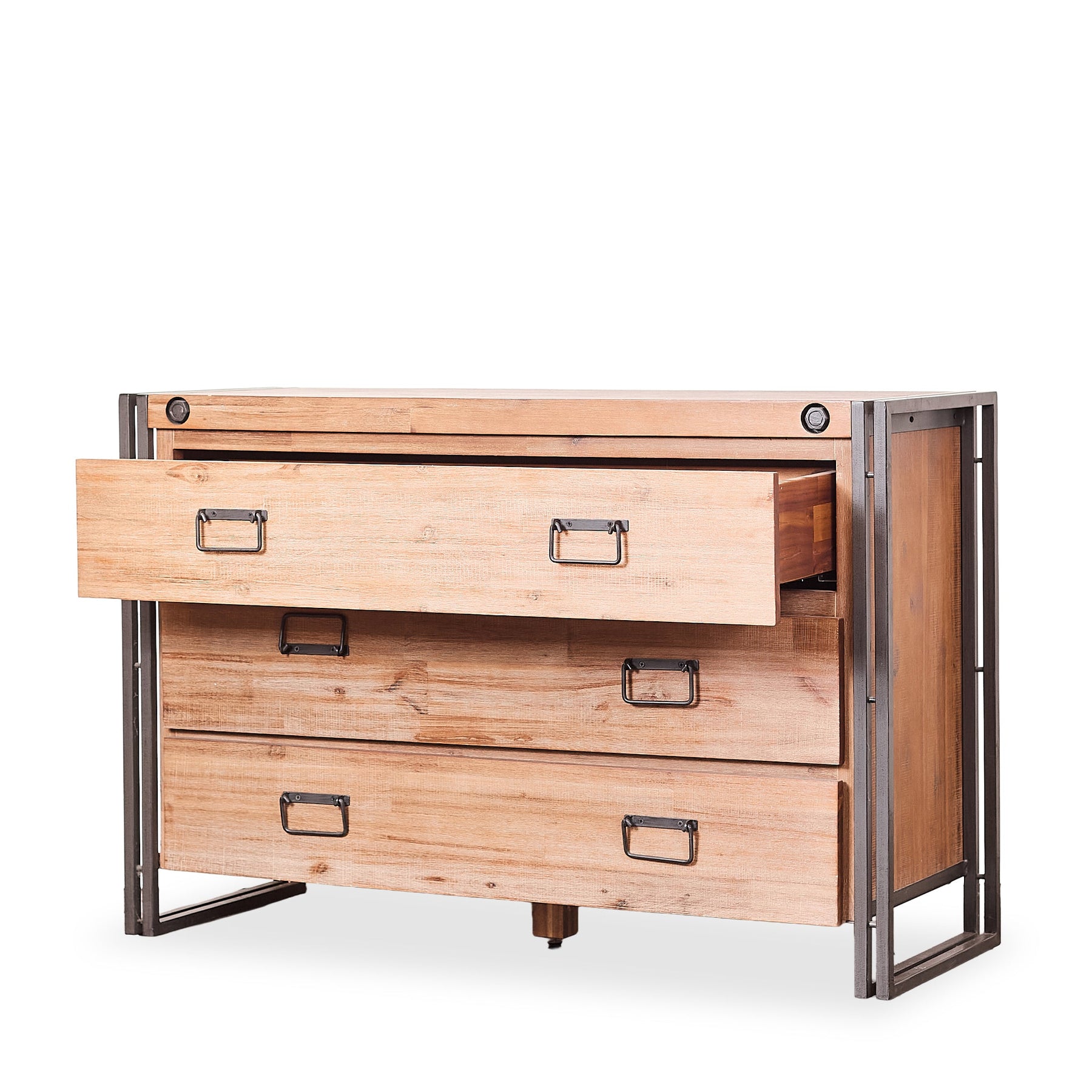 The Harlan Industrial Mid-Century Dresser in Natural Acacia blends utilitarian design with warm natural wood, offering a bold mix of style and strength. Featuring solid acacia wood drawers framed in powder-coated steel, exposed hardware, and vintage-inspired pulls, this piece is perfect for loft-style bedrooms or urban modern interiors. Whether you’re looking for functional storage or a character-rich focal point, this three-drawer dresser is a rugged yet refined choice. Lifestyle images may be AI-generated. Please refer to the standalone images or request additional angles for accuracy.