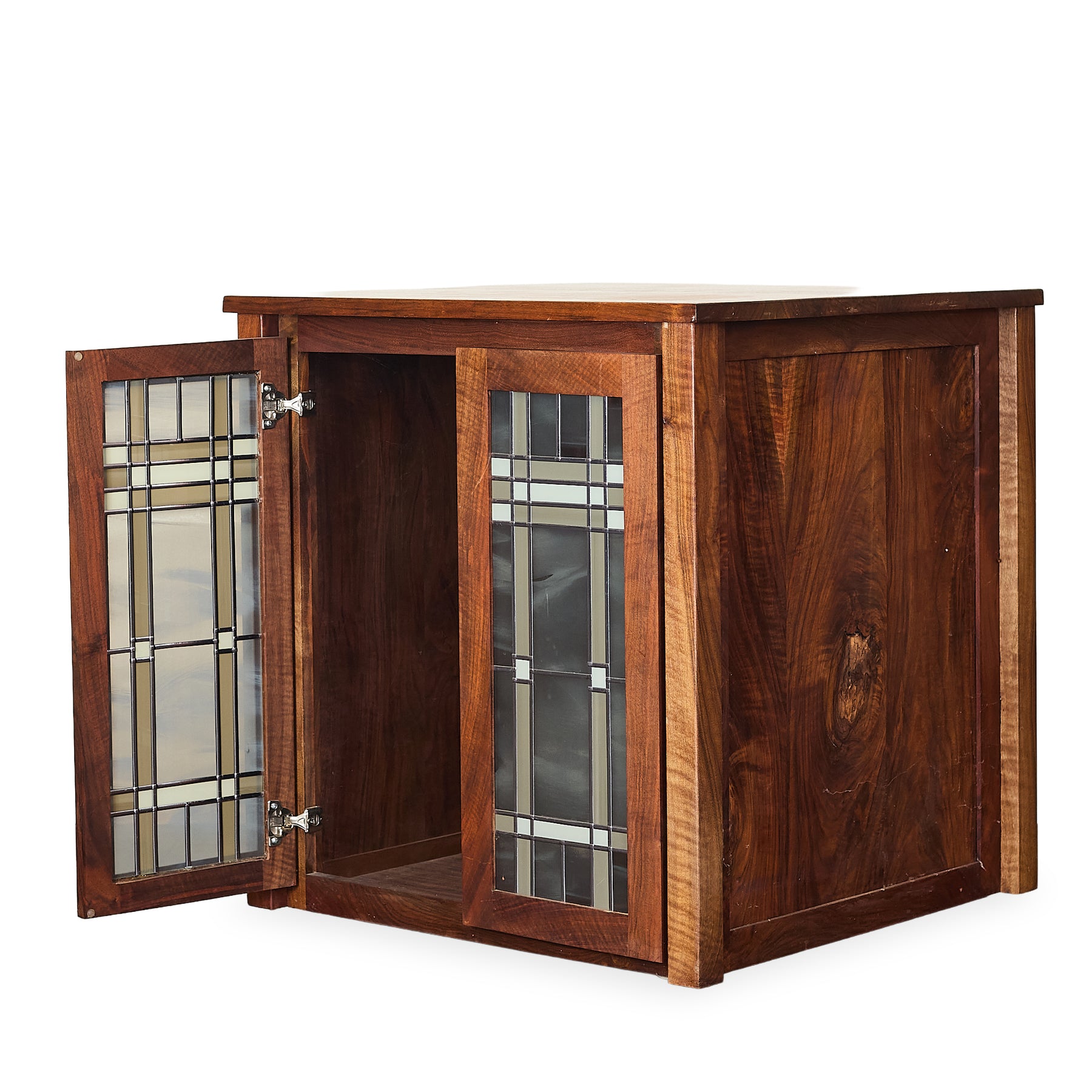 Prairie Walnut Accent Cabinet blends Arts and Crafts style with hand-finished walnut craftsmanship, offering a striking mix of warmth and architectural glass detail. Featuring geometric leaded glass doors, rich walnut grain, and clean rectilinear lines, this piece is perfect for living rooms, entryways, or dining areas. Whether you’re looking for a statement storage solution or a refined display piece, this accent cabinet is a timeless and durable choice. Lifestyle images may be AI-generated. Please refer to the standalone images or request additional angles for accuracy.