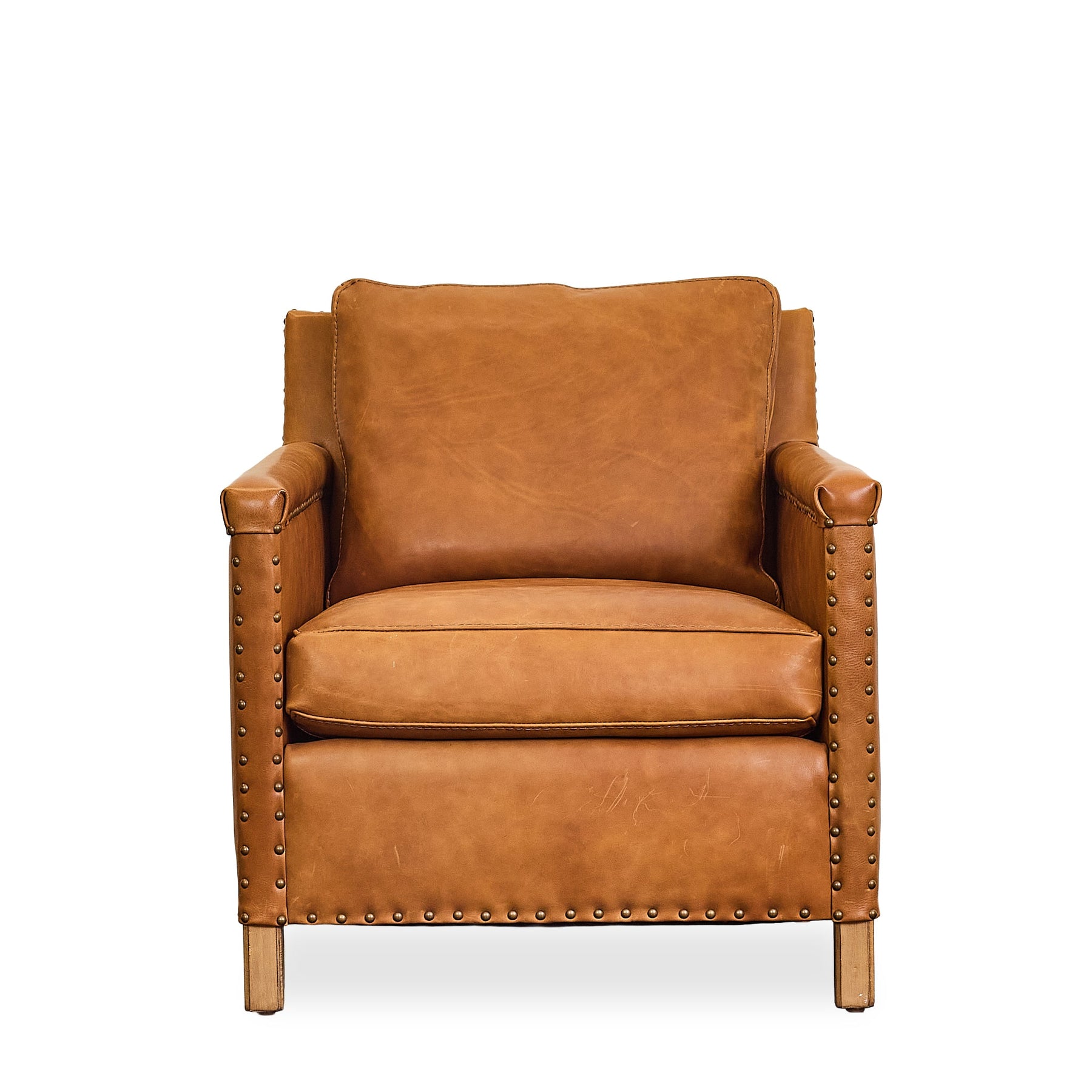 The Remy Leather Club Chair blends classic club chair proportions with rich camel-toned leather, offering a luxurious seat with vintage appeal. Featuring hand-applied nailhead trim, plush cushioning, and solid wood block feet, this piece is perfect for libraries, lounges, or masculine-inspired interiors. Whether you’re seeking a distinguished accent or a cozy reading companion, this armchair is a timeless and indulgent choice. Lifestyle images may be AI-generated. Please refer to the standalone images or request additional angles for accuracy.