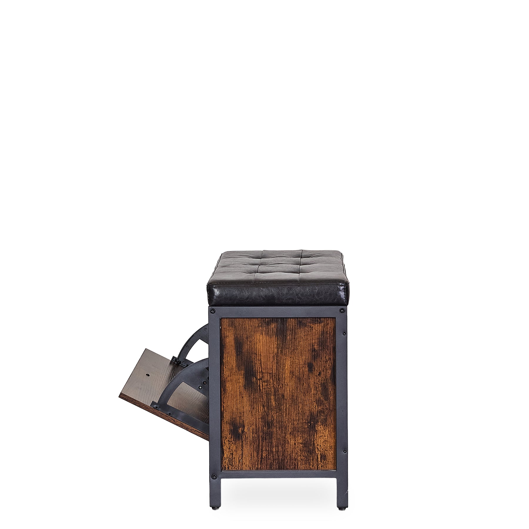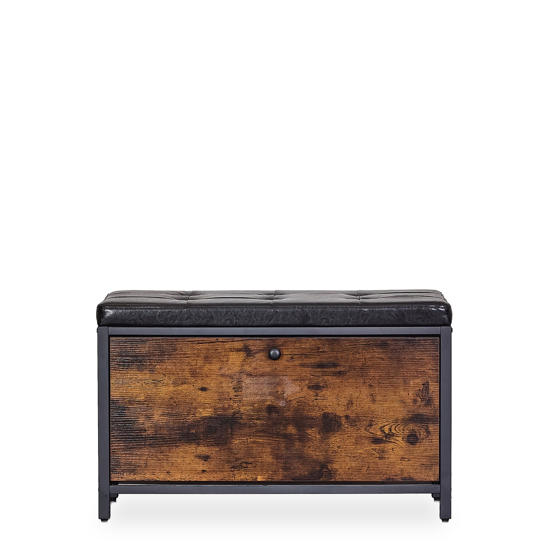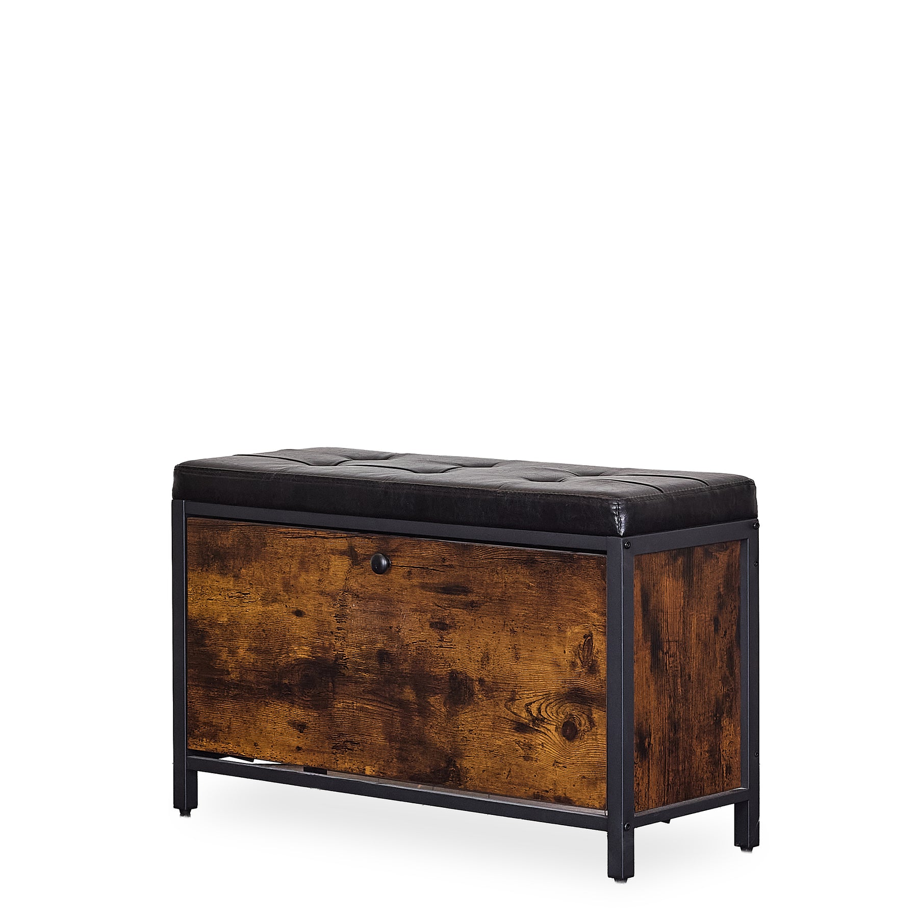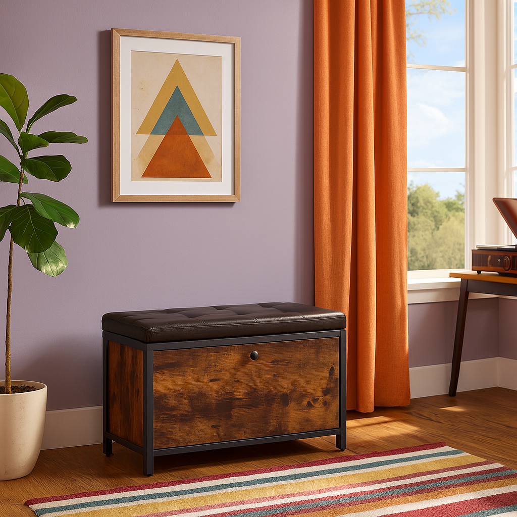 Langdon Storage Bench blends industrial character with mid-century practicality, offering a stylish solution for seating and storage in one. Featuring a tufted black faux leather cushion, warm distressed wood panels, and a sturdy black metal frame, this piece is perfect for entryways, bedrooms, or modern living spaces. Whether you’re looking for a functional accent or a compact storage option, this mid-century storage bench is a versatile and enduring choice. Lifestyle images may be AI-generated. Please refer to the standalone images or request additional angles for accuracy.