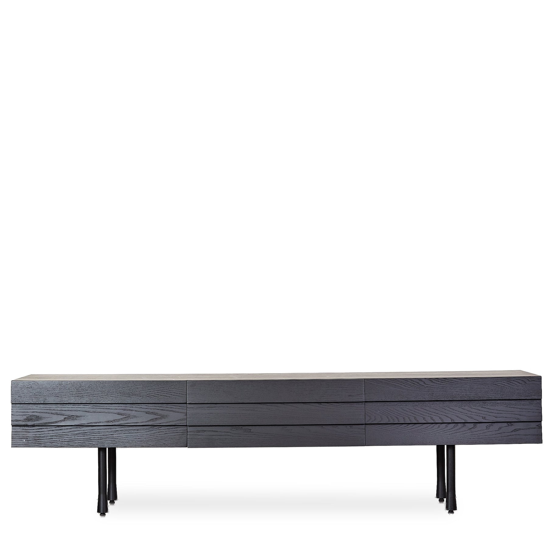 The Calder Low Media Console blends architectural form with a deep black oak finish, offering sculptural drawer fronts and elevated minimalism. Featuring slatted horizontal detailing, soft-close drawers, and slim iron legs, this piece is perfect for modern living rooms, media lounges, or refined office spaces. Whether you’re organizing electronics or showcasing curated objects, this media console is a sleek, statement-making choice. Lifestyle images may be AI-generated. Please refer to the standalone images or request additional angles for accuracy.