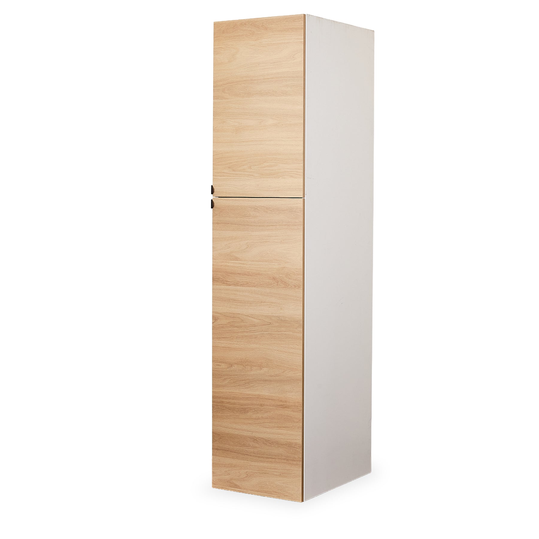 The Elba Tall Storage Cabinet blends minimalist design with a warm natural woodgrain finish, offering vertical efficiency in a sleek, modern form. Featuring matte white sides, flat-panel doors with subtle grain detailing, and discreet metal handles, this piece is perfect for home offices, bathrooms, or compact living spaces. Whether you’re organizing linens, pantry items, or office supplies, this storage cabinet is a clean-lined, space-saving choice. Lifestyle images may be AI-generated. Please refer to the standalone images or request additional angles for accuracy.