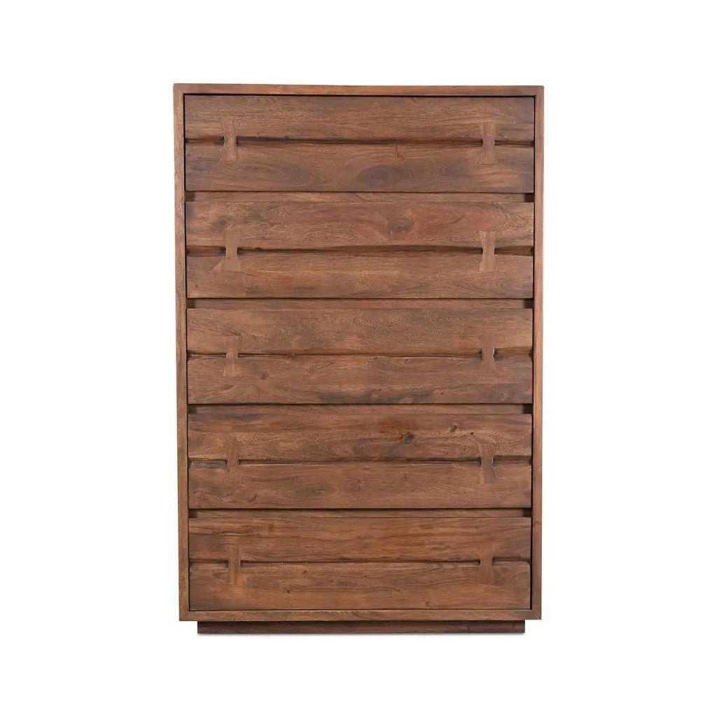 Storage solutions have never looked so good. The Madagascar chest of drawers features solid, live-edge acacia. A warm brown finish highlights the natural wood grain and creates a warm, inviting look for your home—ideal storage for the bedroom, living room, or dining room
