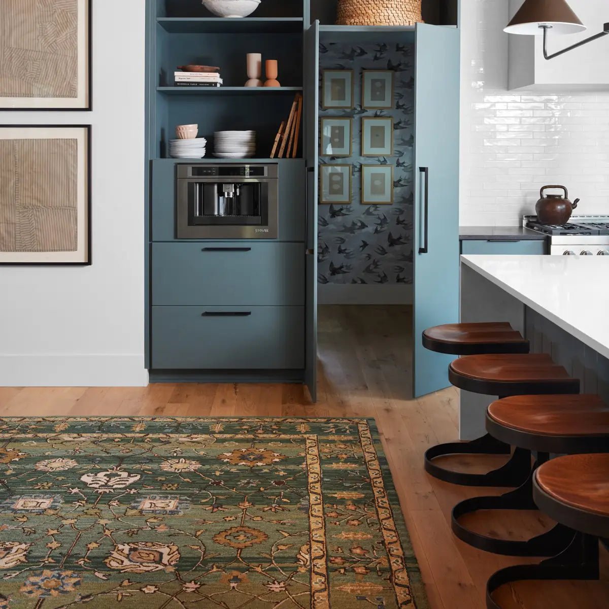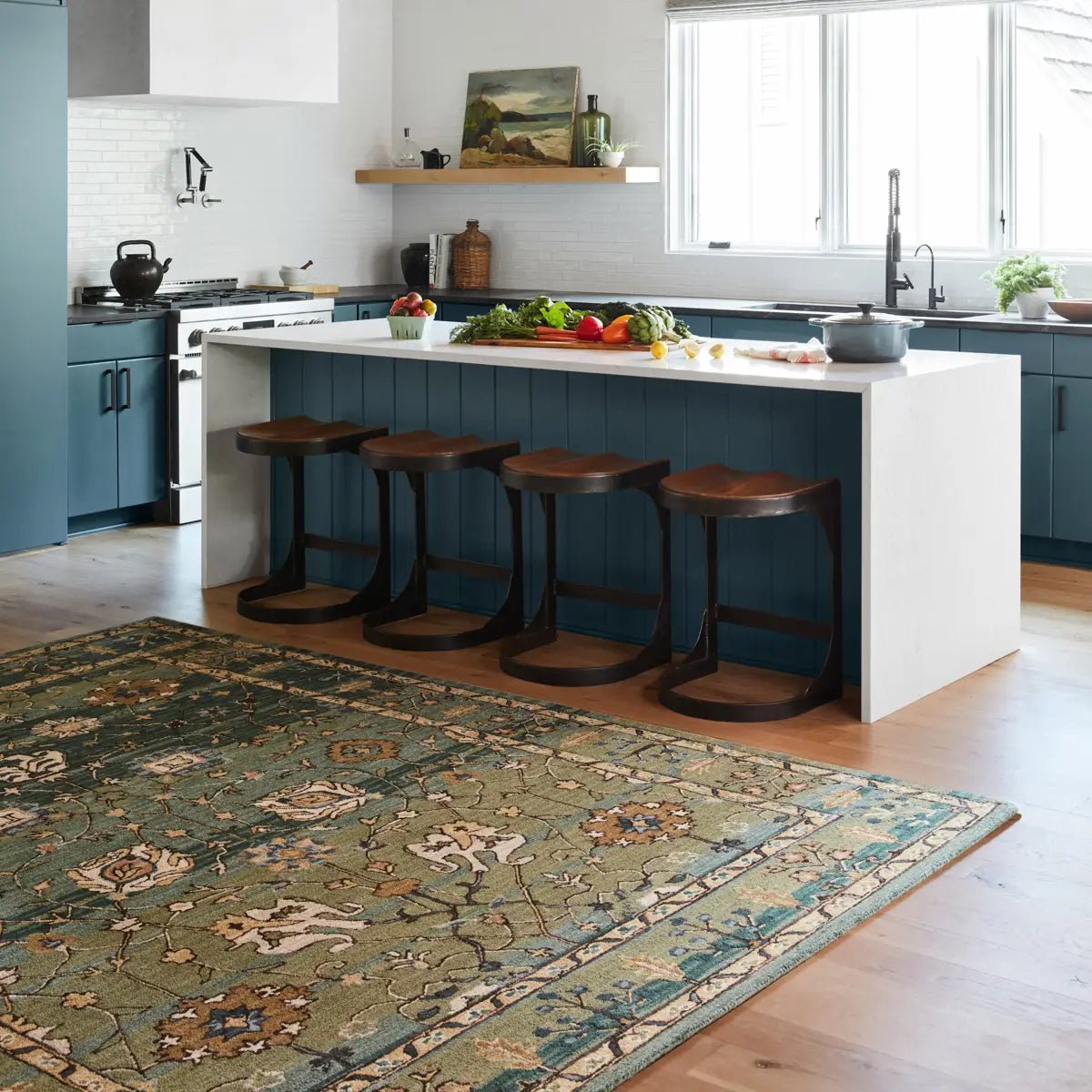 The hand-tufted Cardamom collection boasts vivid jewel tones and uniquely distressed Turkish motifs, crafted to emulate traditional sun-faded, vintage designs. The Ahava rug showcases an open, floral medallion motif in a verdant palette of green, tan, and blue. Inspired by the artistic imperfection of dye-lot changes in perfectly aged wool textiles, the looped pile of this rug features tonal colorway depth and textural dimension. Custom sizes available.