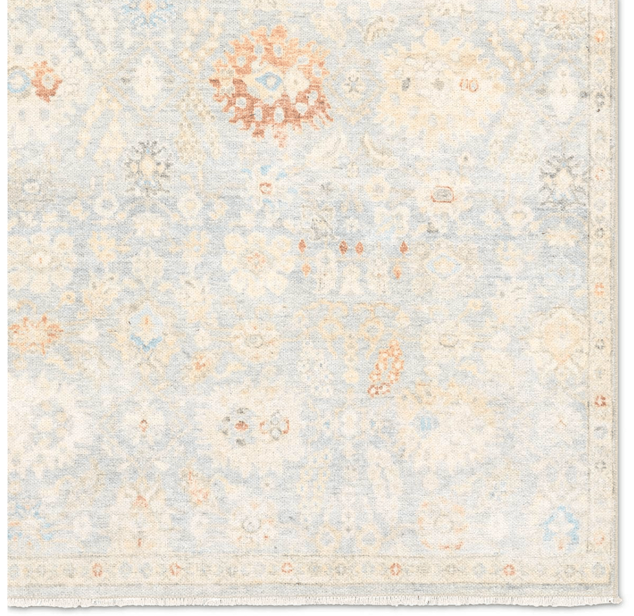 The Boheme collection brings vintage inspiration to life with ornate, worldly designs and a timeless distress effect. The Doire area rug features an updated traditional, pastel Oushak pattern in faded yet comforting hues of light blue and cream, with hints of orange, yellow, and gray. Soft florals, a thin border, tasteful distressing, and short, cream fringe create an elegant, vintage feel. In Turkey, this design is printed onto a 1/6th inch thick cotton, polyester, and soft chenille base with a flat finish and low-profile feel. Printed rugs are durable, easy to clean, and comfortable underfoot perfect for high traffic areas of the home like playrooms, halls, living rooms, and entryways.