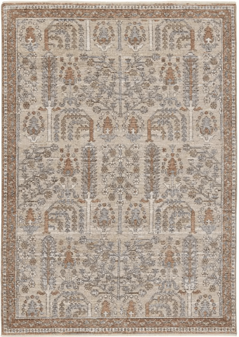 Inspired by the distressed perfection of antique textiles, the Lark collection is warm and inviting with rich, updated hues. The updated traditional Regard area rug showcases an intricate, floral design paired with short, cream fringe. The nature-inspired details spring to life in hues of slate, bronze, cream, and taupe. This indoor rug thrives in high and low trafficked areas of the home such as living rooms, halls, entryways, bedrooms, and dining areas.