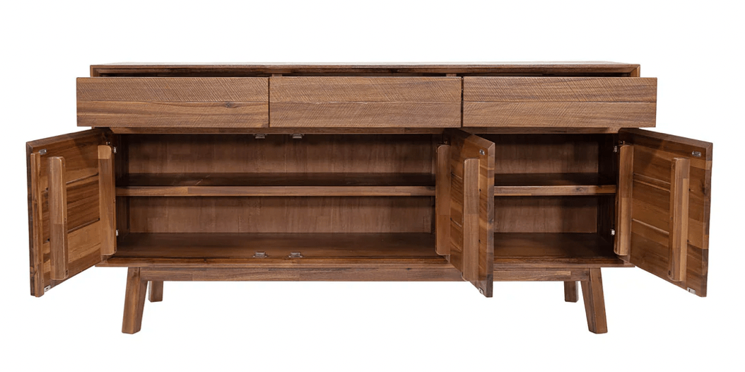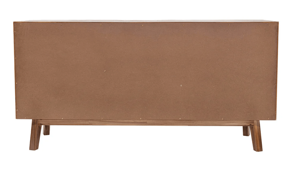 Acacia: top, doors, drawer front, legs; MDF Acacia veneer: back panel, shelves, side panels, drawer bottom; Frame construction/ Joinery: Mortise and tenon/ Coner block / double dowel/ glue/ screwed; Felt lined top drawers; Finished Back: No (plywood); Tip restraint included;