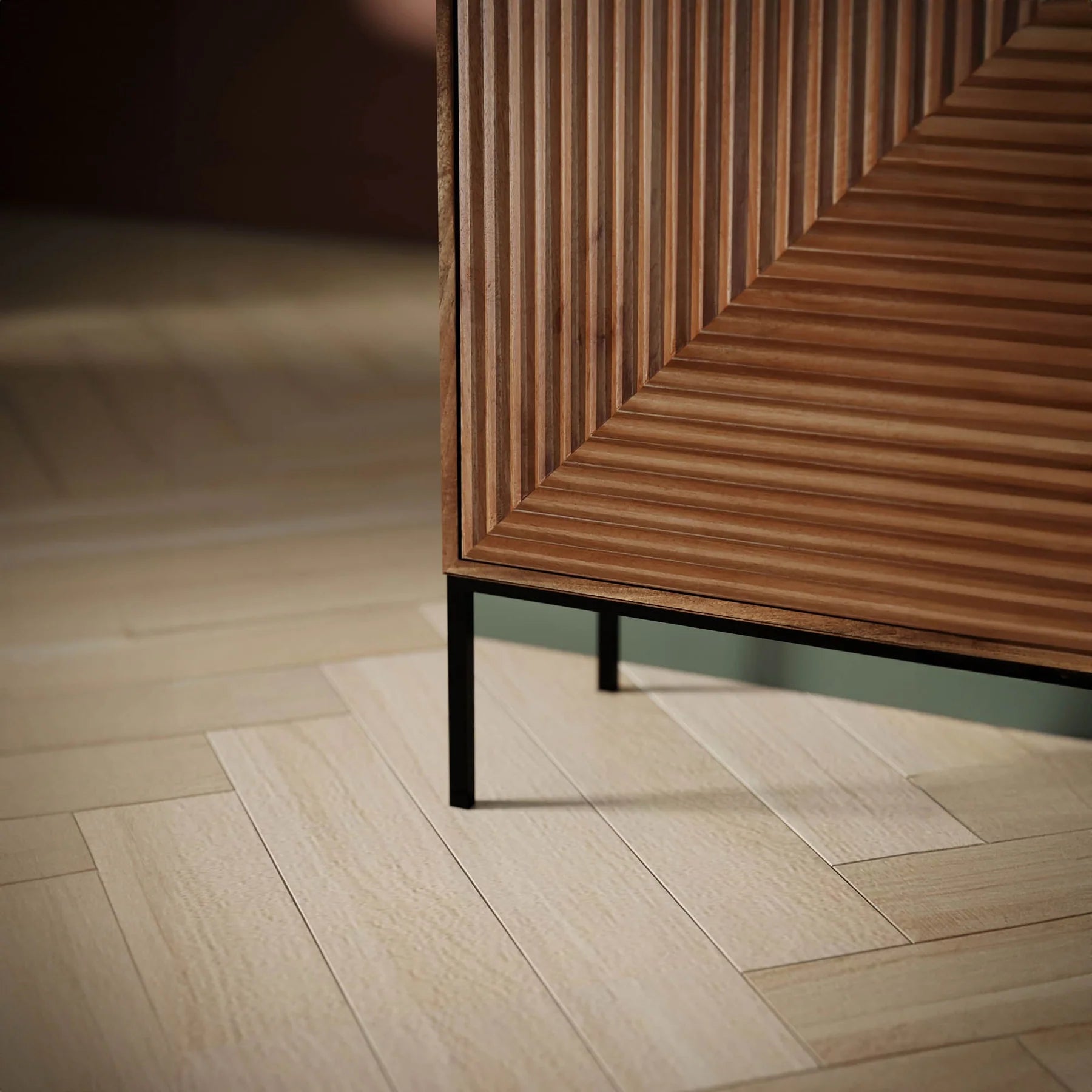 - The standout feature of this sideboard lies in its doors, adorned with an exceptional fluted pattern that seamlessly transitions from vertical to horizontal. This unique design creates a mesmerizing visual effect, turning the sideboard into a statement piece that captures the essence of both sophistication and innovation.