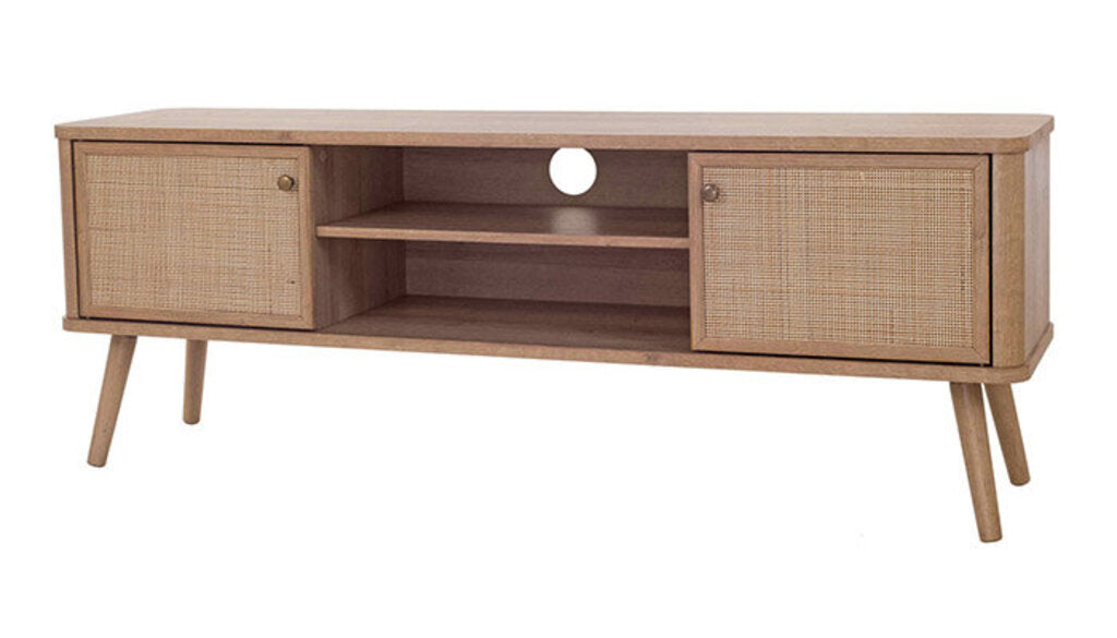 The Sapporo Media Cabinet by Moe’s is a sweet escape for all of your things. The Sapporo media cabinet features darkened natural mango wood juxtaposed with bright geometric accents of brass foil. Its two large doors open to reveal plenty of storage for your entertainment devices, while an open shelving unit offers even more storage opportunities. With its Art Deco inspired flair, this TV table serves as the perfect accent and centerpiece for all your cinematic sessions. Two door media cabinet in mango wood & brass. Dimensions: 55"W x 14"D x 17.75"H