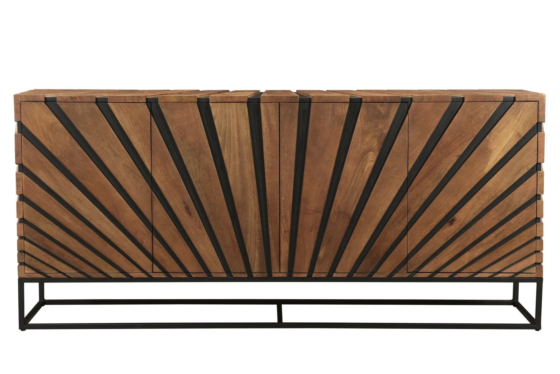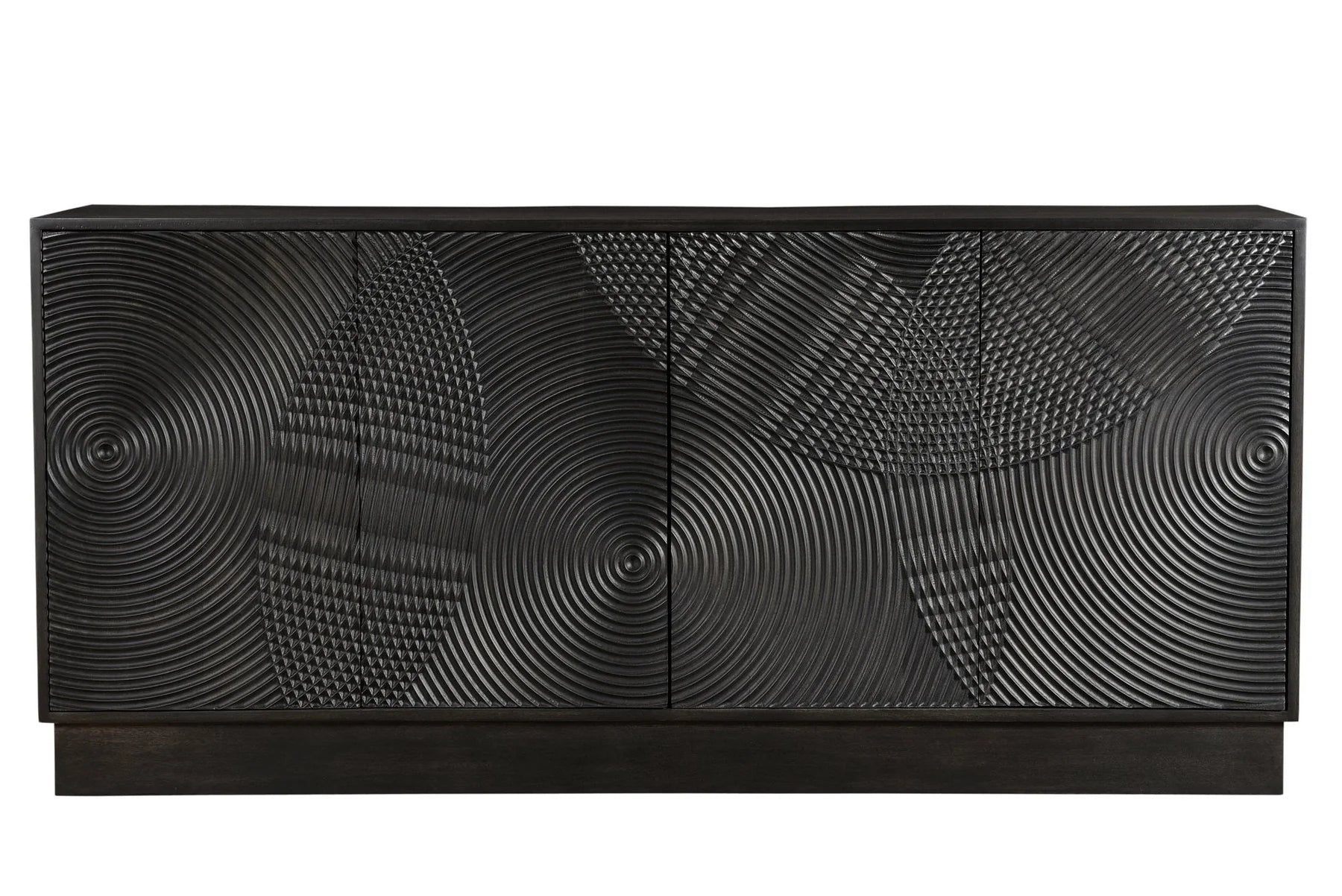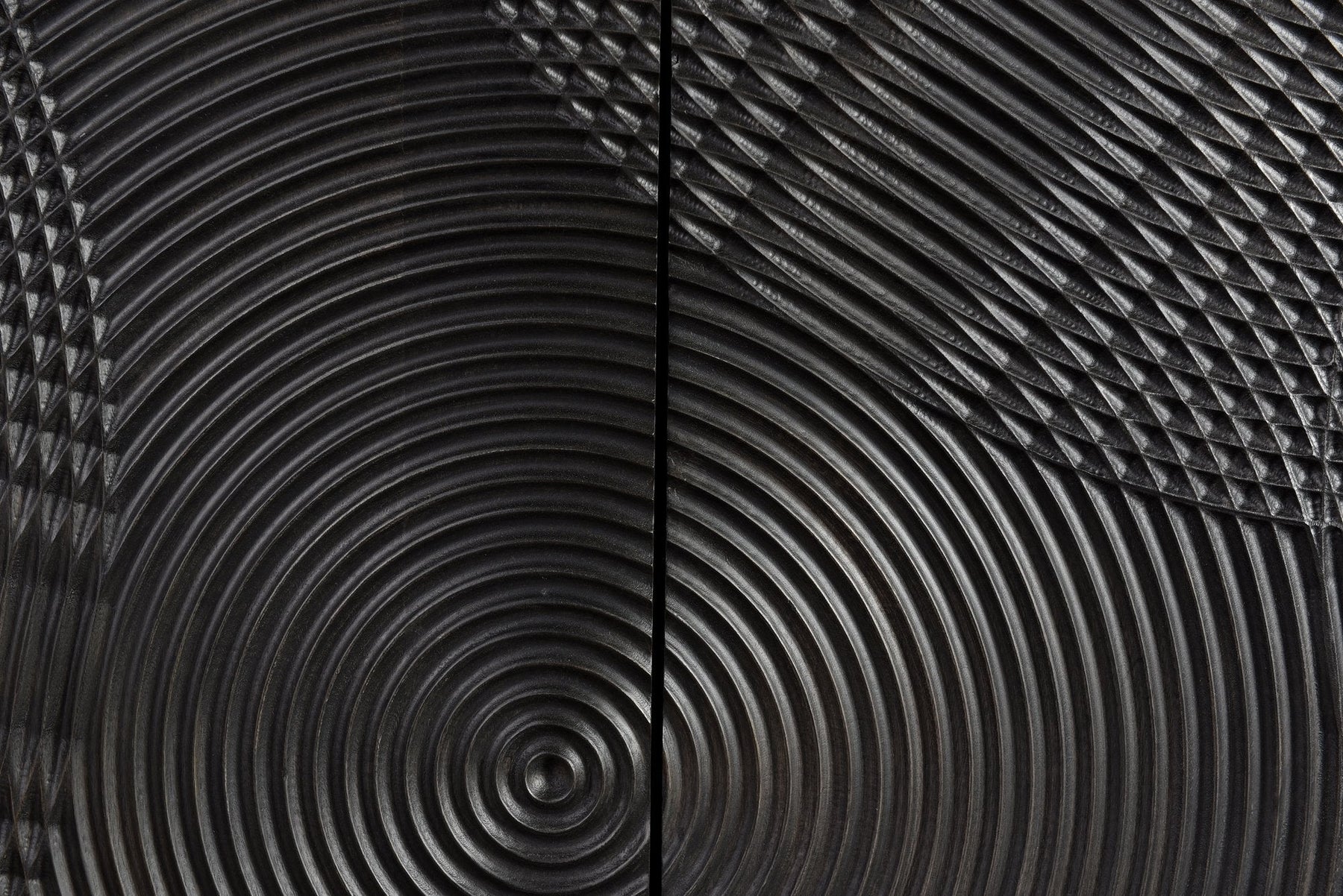 Concentric circles decorate the front of this unique and stylish piece. Made from naturally sourced mango wood, this whimsical sideboard has plenty of storage space and a mesmerizing aesthetic. When observing the ripple-like pattern found on the door fronts, one may be taken to a dark rainy night in the Amazon, where rain meets water. With its sturdy construction, this piece is perfect for your home.