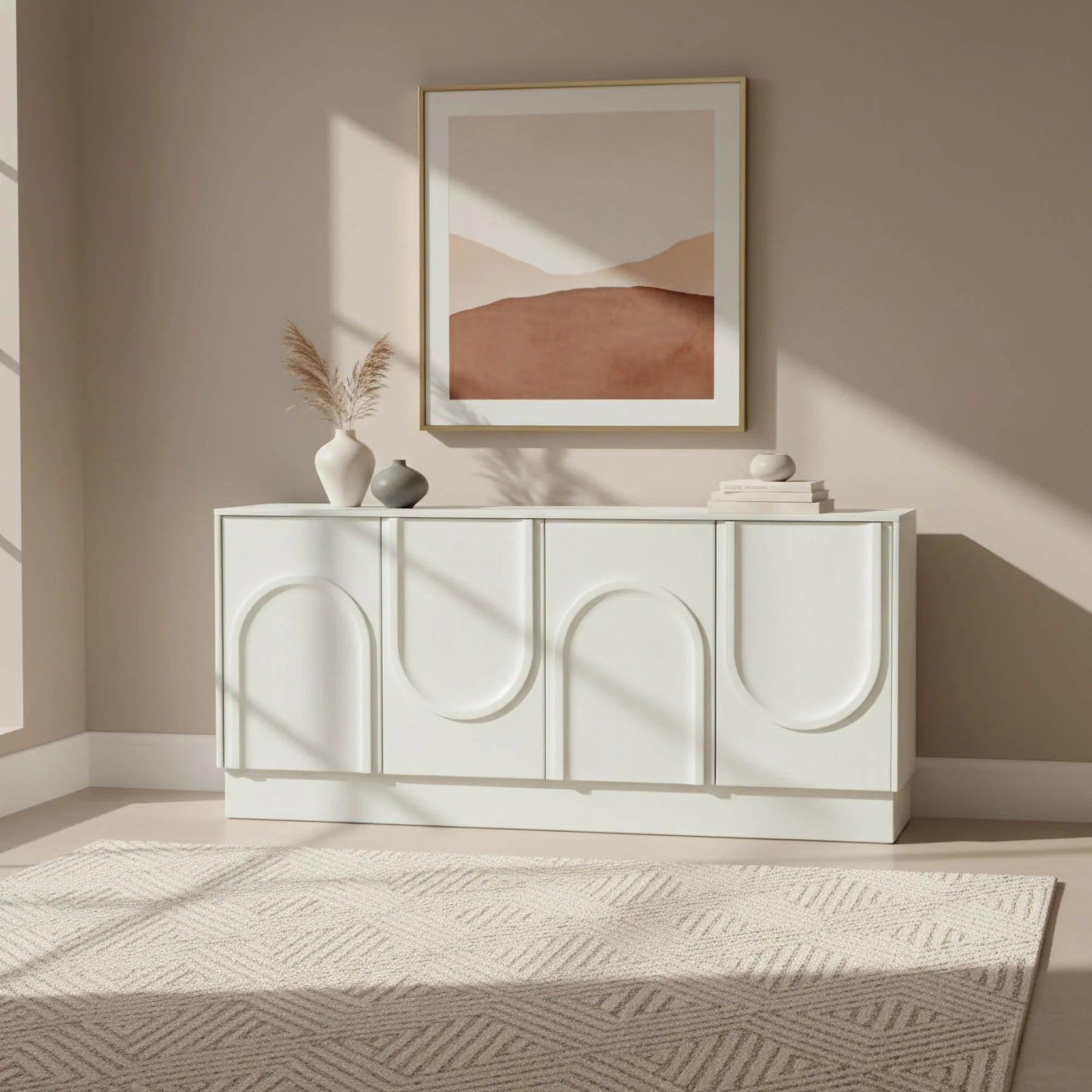 • Beyond its visual appeal, the Tempo Sideboard is designed for practicality. The thoughtfully arranged storage space behind the arched doors provides ample room to organize and declutter your living area with style.