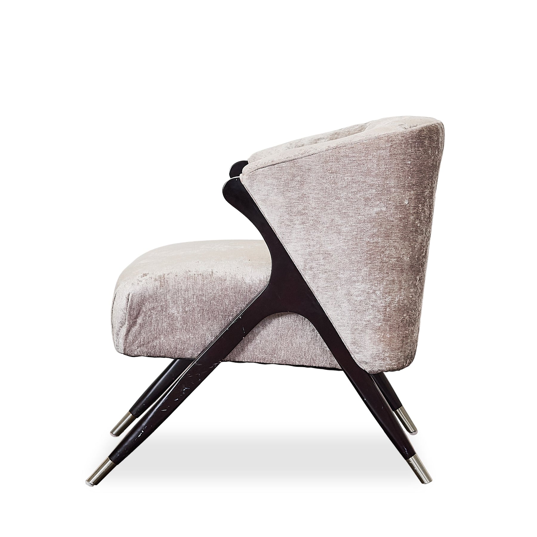 The Florence Accent Chair blends bold mid-century styling with plush contemporary comfort, offering a striking silhouette wrapped in luxurious velvet. Featuring angular espresso-finished wood framing, deep channeled upholstery, and tapered legs capped in polished metal, this piece is perfect for refined living rooms, boutique lounges, or statement-making corners. Whether you’re curating a retro-inspired space or seeking a standout accent, this lounge chair is a stylish and sophisticated choice. Lifestyle images may be AI-generated. Please refer to the standalone images or request additional angles for accuracy.