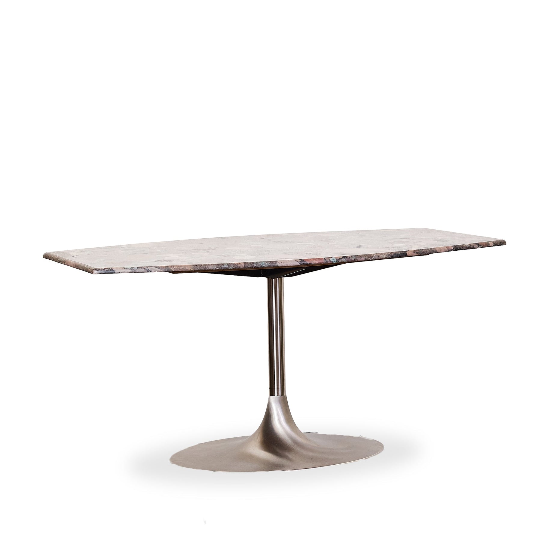 The Riviera Pedestal Dining Table with Marble Top blends sculptural mid-century elegance with a natural stone surface, offering a refined focal point for dining interiors. Featuring a uniquely contoured marble slab in soft rose and grey tones atop a satin-finish tulip base, this piece is perfect for modern dining rooms, breakfast nooks, or statement office settings. Whether you’re hosting intimate gatherings or elevating everyday meals, this dining table is a sophisticated, heirloom-quality choice. Lifestyle images may be AI-generated. Please refer to the standalone images or request additional angles for accuracy.