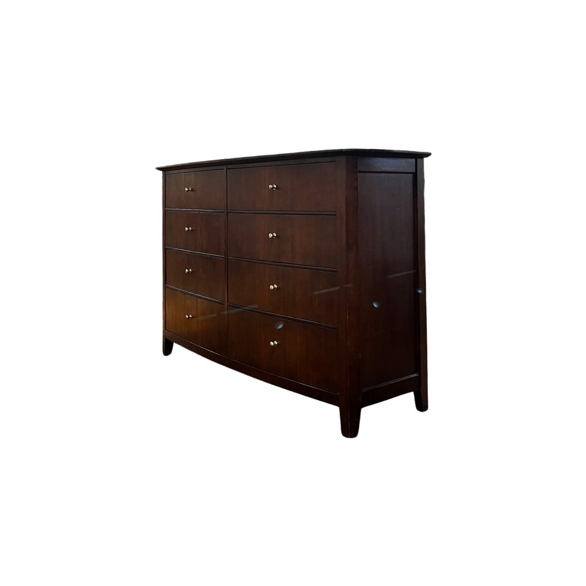 This stunning dark walnut dresser is a timeless addition to any room, boasting a rich, sophisticated hue that evokes the warmth of mid-century design. Measuring 64 x 20 x 40, its compact footprint makes it perfect for smaller spaces. In good condition, with a gentle patina that speaks to its pre-owned history, this curated piece is ready to be cherished. It pairs beautifully with gold accents and a vintage area rug.