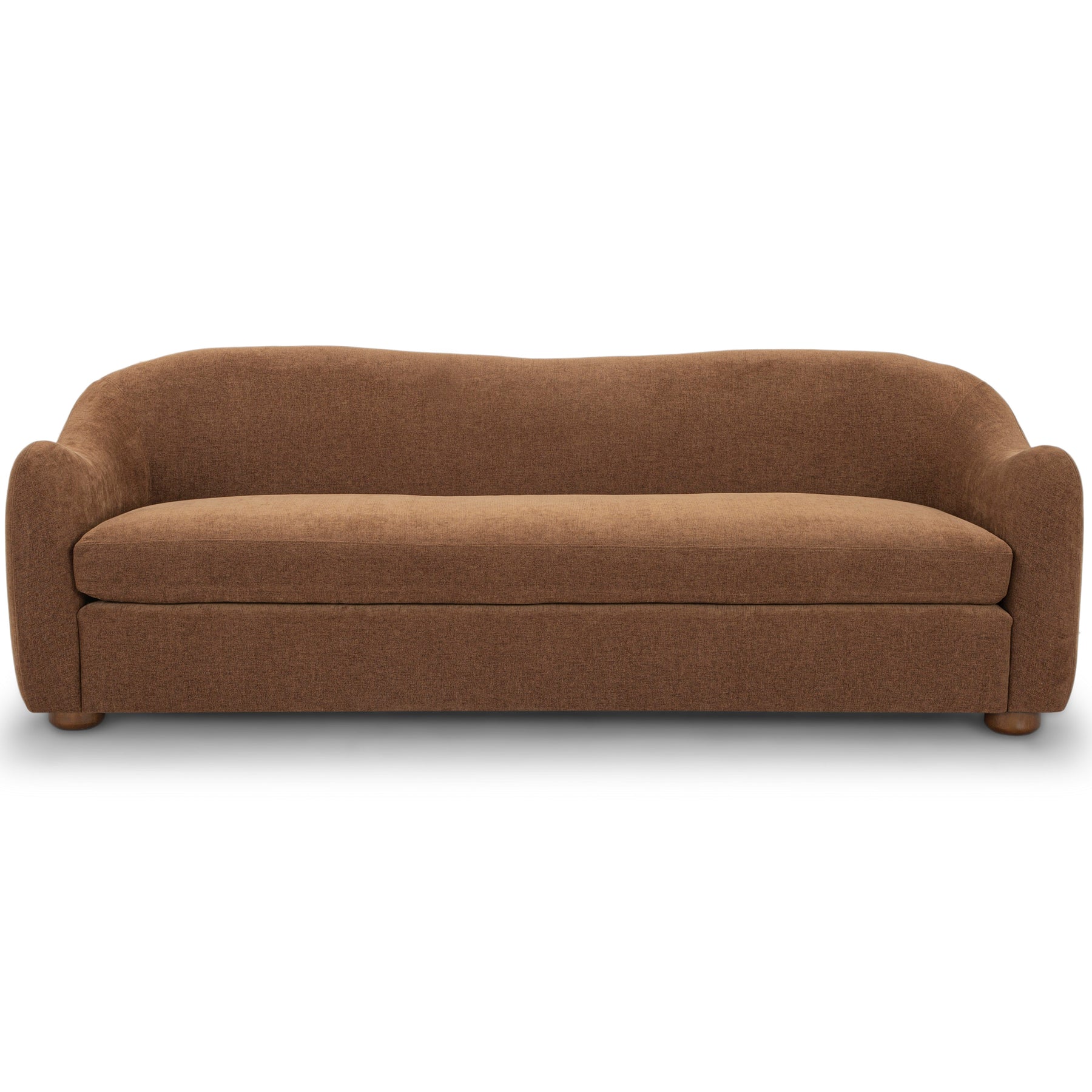 Joss Curved Sofa blends mid-century modern elegance with rich textured upholstery, offering a sculptural silhouette that radiates warmth and sophistication. Featuring gently sloped arms, plush cushioning, and low-profile wooden legs, this piece is perfect for living rooms, lounges, or refined open spaces. Whether you’re creating a statement centerpiece or a cozy social hub, this sofa is a timeless and luxurious choice. Lifestyle images may be AI-generated. Please refer to the standalone images or request additional angles for accuracy.