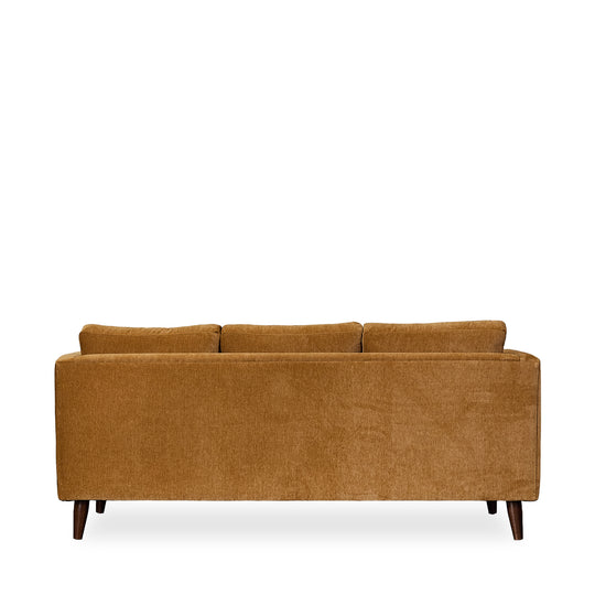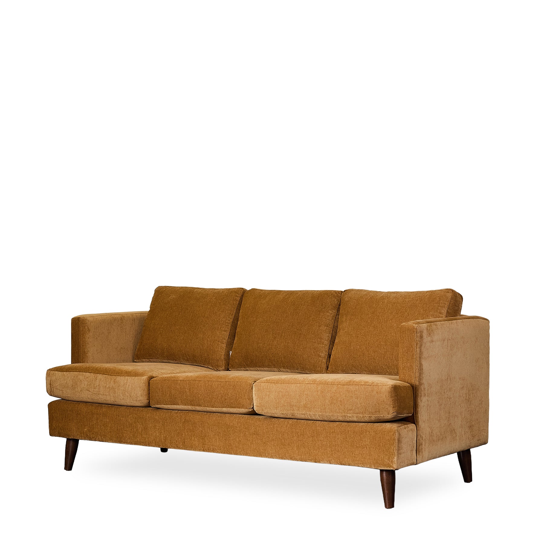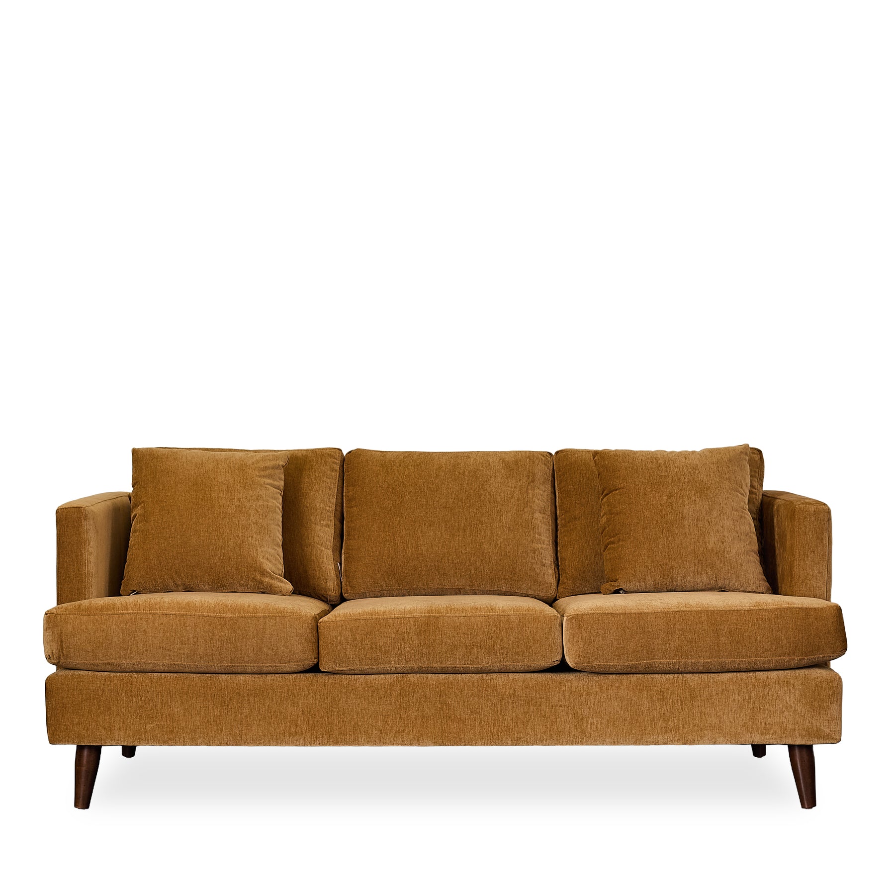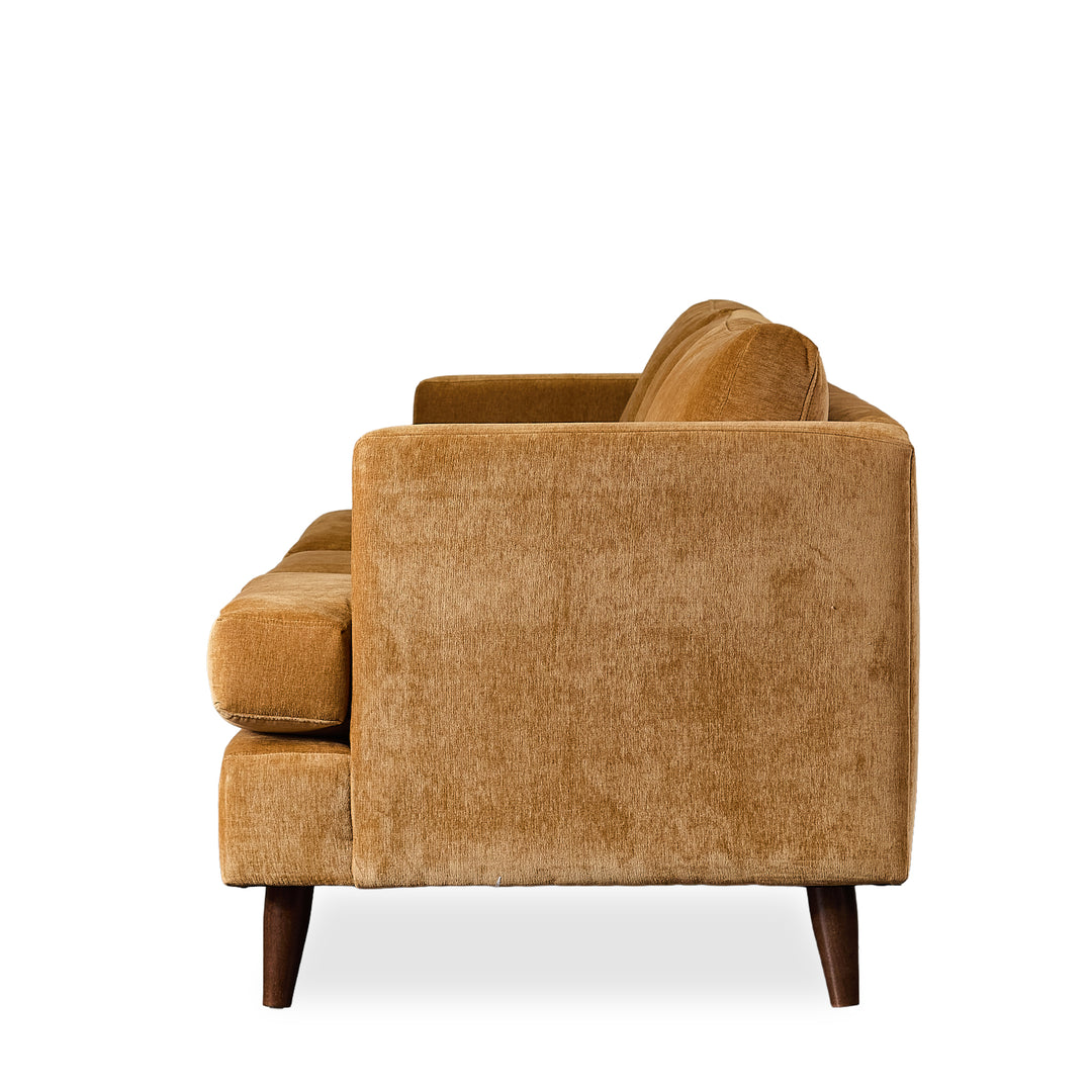 The Enya Contemporary Sofa in Gold combines sleek design with plush comfort. Upholstered in Tempest Gold fabric, its clean lines and compact size make it a stylish addition to any modern living space
