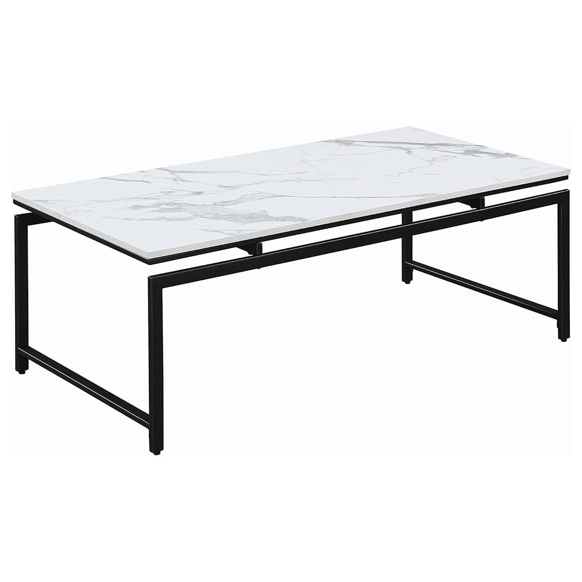 A modern coffee table with black gunmetal frame and faux marble top. Matching end tables available.