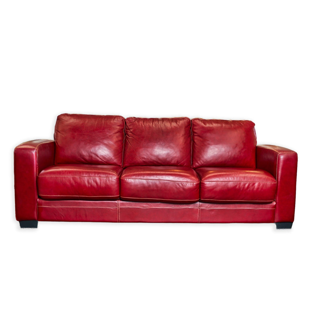 Make a bold and practical statement with this Consigned Leather Sleeper Sofa, featuring smooth, rich red leather upholstery and plush, supportive seating. With its deep seat cushions, full back pillows, and track arm design, this sofa offers the perfect blend of style and comfort for any space in need of a showpiece.