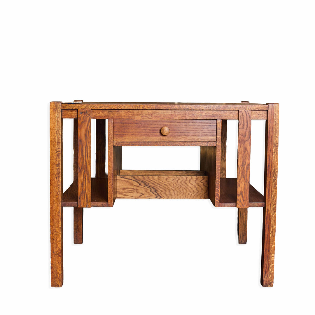 This vintage Mission-style desk offers classic form and practical function. Crafted from solid oak, it features a single drawer, an open cubby beneath, and side shelving for storage or display. Its compact footprint makes it a versatile piece—use it as a writing table, entryway accent, or side console.